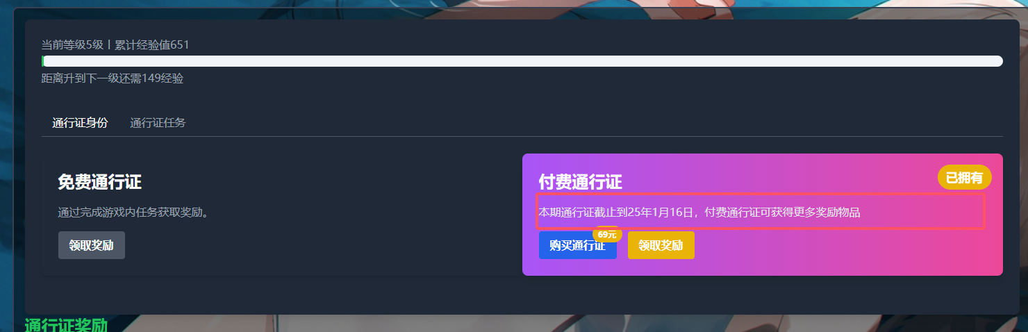 - 通行证等级 【对应前面的通行证等级达到多少等级可以领取奖励】