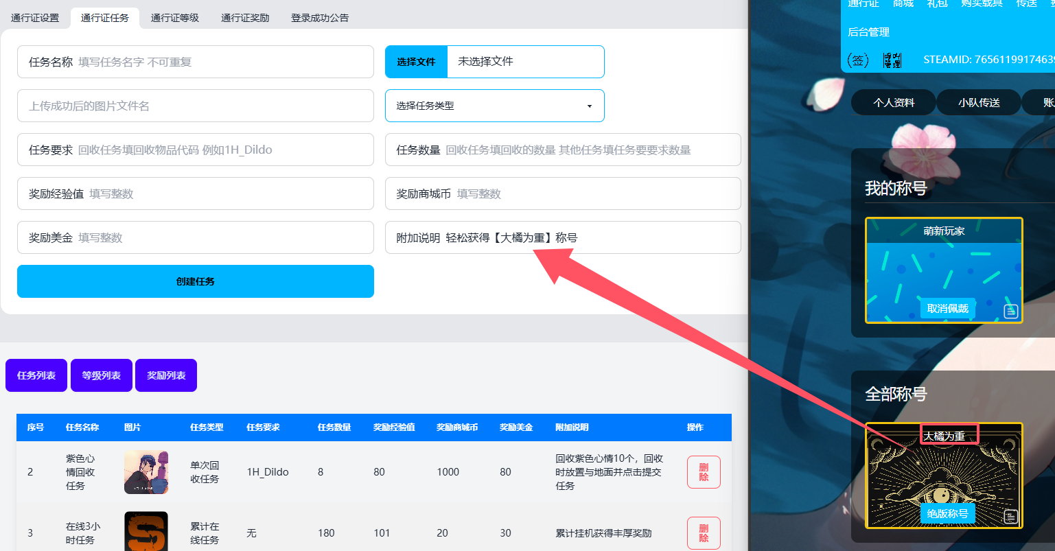 - 通行证等级 ,从低往高进行填写添加 比如 1 2 3 4 5 6 7 理论可以无限制等级,这个等级是需要玩家做任务获取经验值达标的,会跟后面的领取奖励挂钩