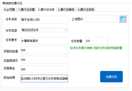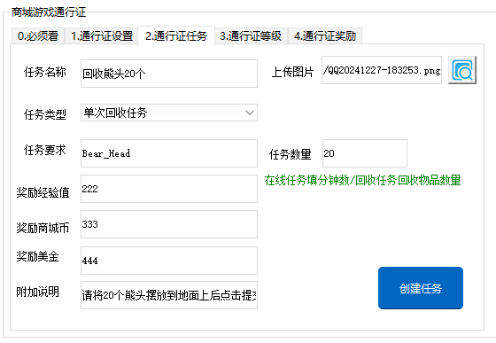 填写需要完成的数值,3 4类型任务时填写物品数量,在线任务填写分钟数/击杀填写需要击杀多少玩家的数量/开锁填了是指开锁成功的数量 - 奖励经验值 奖励多少经验值,这个经验值用于提升通行证等级【不知道填多少?没关系,可以先去看通行证等级的解释文档】