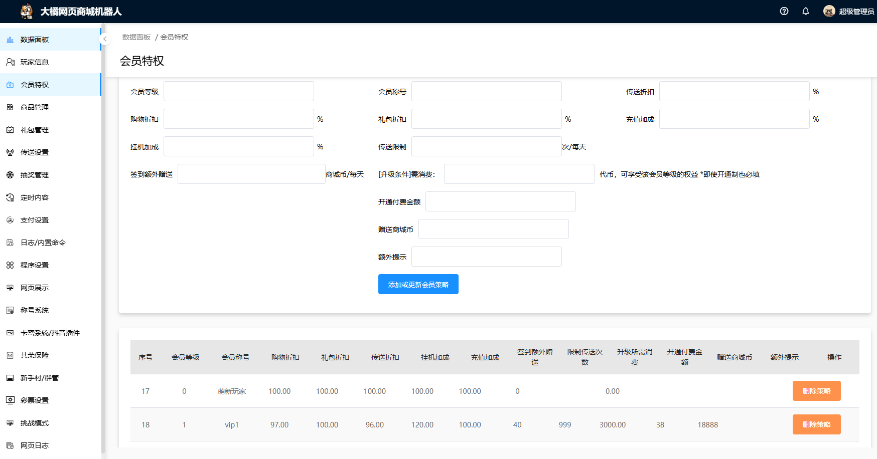 【会员等级】填写整数0-999都可以,建议从0 1 2 3 4 5 6按顺序进行【添加或更新会员策略】