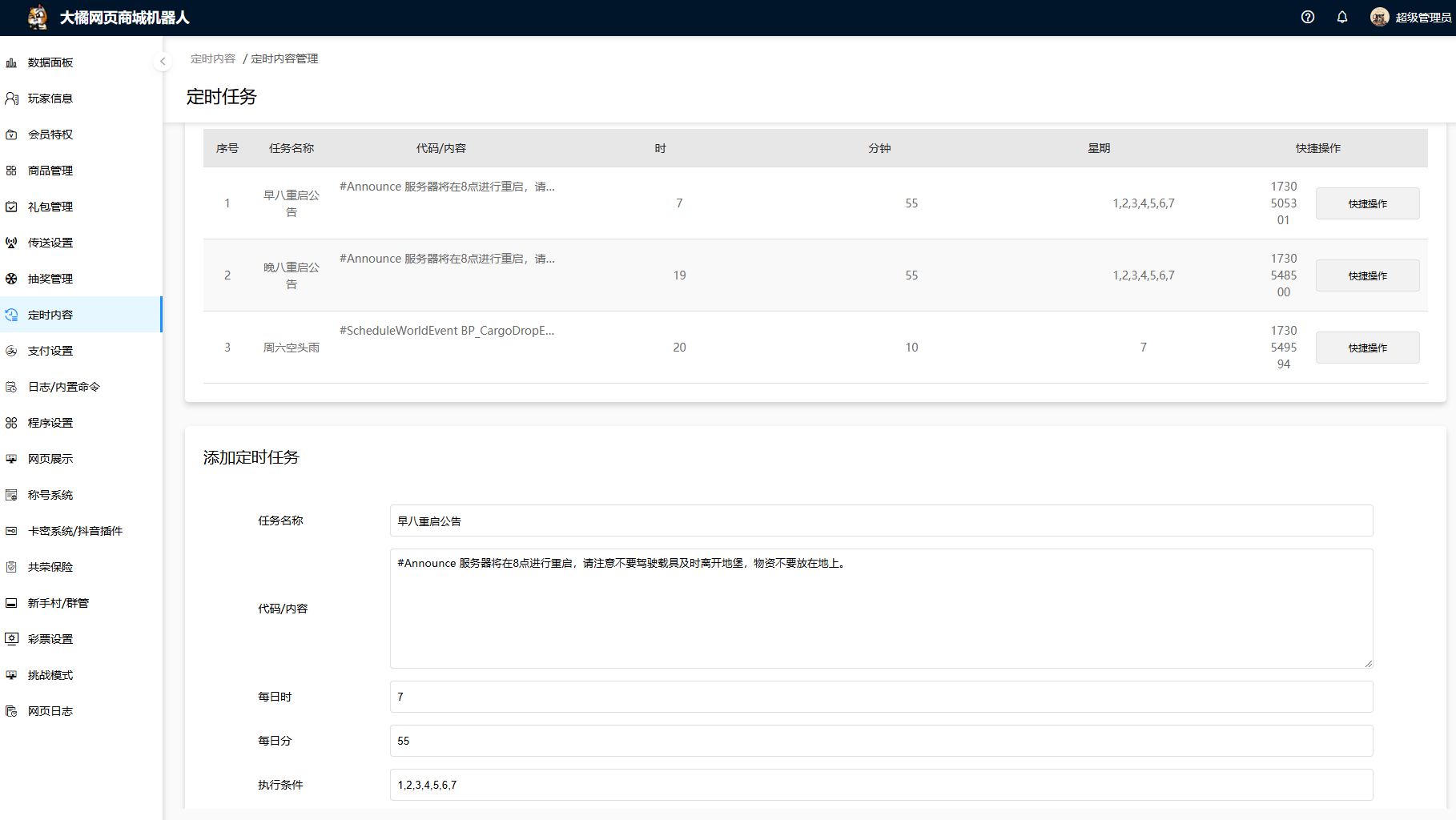 本功能可实现定时开关高达/定时多倍回收/定时diy魔改等等通过上传服务器配置文件到服务器来进行动态调整服务器中的玩法。